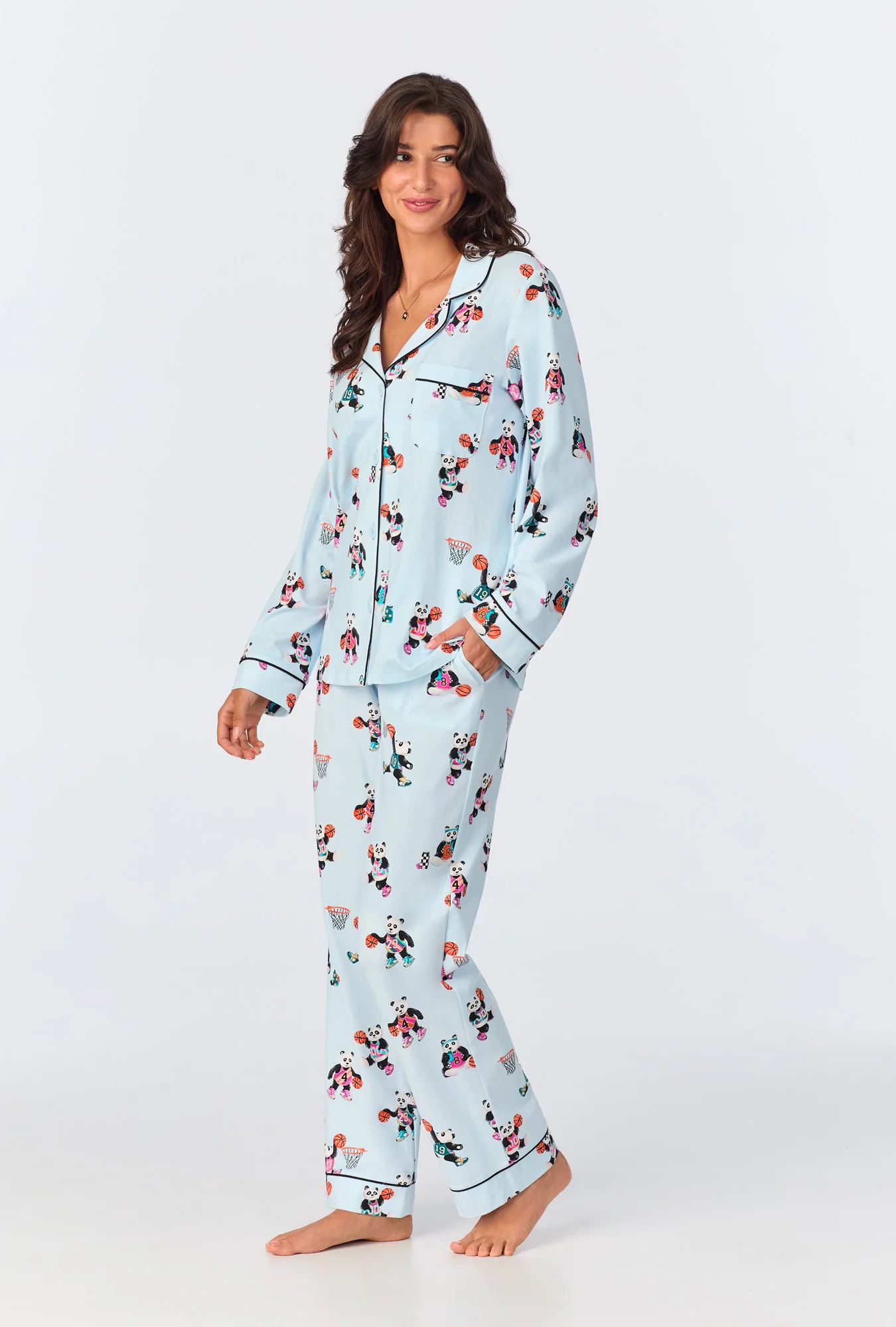 Our women’s cotton jersey long sleeve pajamas adorned with a playful blue panda print are cozy and comfortable. Contrast black knit piping at collar and cuffs, a notch collar, and chest pocket tailor the look; and pull-on pant with an elastic waistband and pockets make for easy extended wear.
